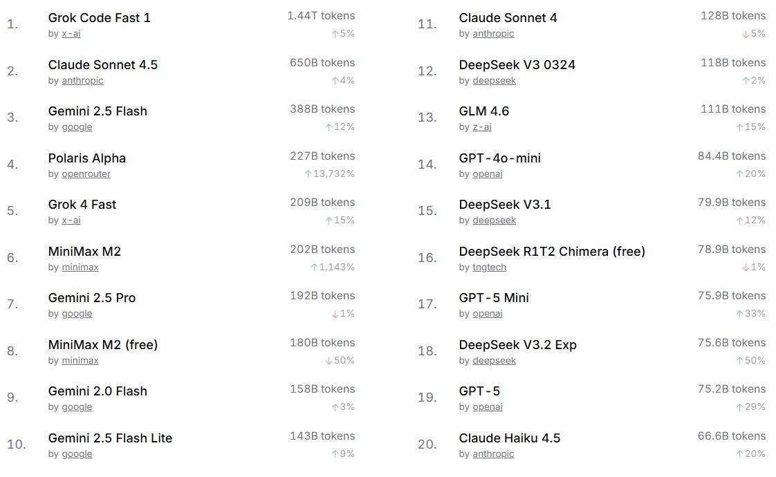 OpenRouter官网显示,在近一周的模型调用榜单上,排名前二十的模型中,中国模型已占据七席。而Kimi K2更与同期发布的Grok4登上增长榜前两名,日处理量突破100亿Token。