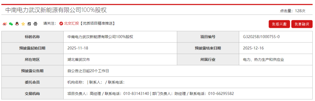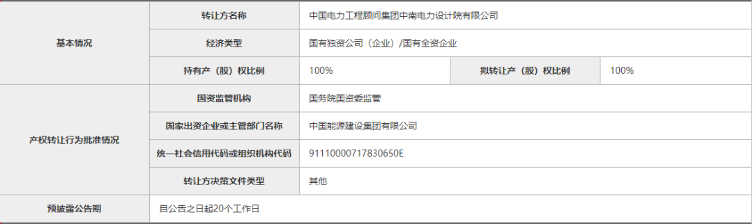 11月18日泛策略,北京产权交易所披露信息显示,中国电力工程顾问集团中南电力设计院有限公司挂牌转让中南电力武汉新能源有限公司100%股权。